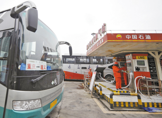 圖為員工準(zhǔn)備為客車(chē)加氣。 鄭海濤 崔斌 攝