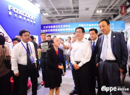 甘肅省委副書記、省長(zhǎng)林鐸(右二),甘肅省副省長(zhǎng)郝遠(yuǎn)(右一)與蘭州市科技局黨組書記、局長(zhǎng)王檸(左)參觀富士康展臺(tái)