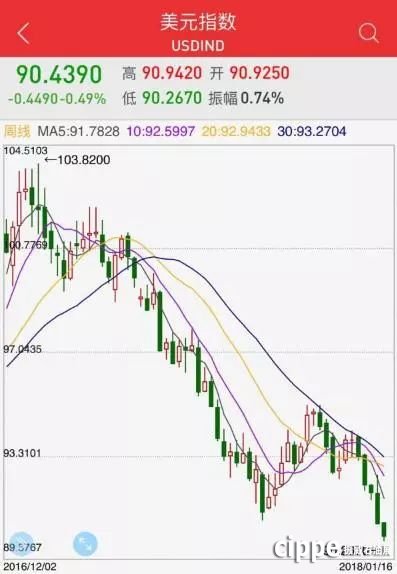從2017年1月1日起,美元指數(shù)開始了漫漫下跌之旅,從高點(diǎn)103.78下跌至目前的90.29,跌幅達(dá)13%。