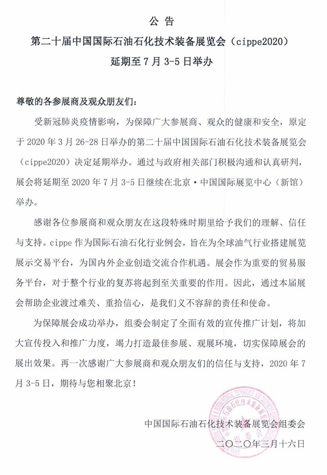 受新冠肺炎疫情影響,原定于2020年3月26-28日舉辦的第十屆北京國際天然氣技術(shù)裝備展覽會(CING2020),將延期至7月3日至5日在北京·中國國際展覽中心(新館)舉行,歡迎您屆時參展參觀。同期舉辦的第二十屆中國國際石油石化技術(shù)裝備展覽會也將延期至7月3日-5日。公告內(nèi)容如下: