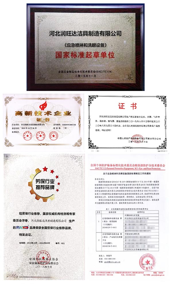 經過多年發(fā)展,潤旺達公司斥資建立了同行業(yè)少有的產品檢測中心,擁有光譜分析儀、鹽霧測試機、壽命測試機、水壓密封測試機、氣密測試機、強度測試機、流量測試機等多臺先進檢測設備,構建高效的企業(yè)研發(fā)和產品檢測體系,參與起草制定了《GB/T38144.2-2019應急噴淋和洗眼設備》國家標準,并以先進的研發(fā)體系,申請獲得了多項洗眼器專利證書,滿足并超越洗眼器行業(yè)需求。