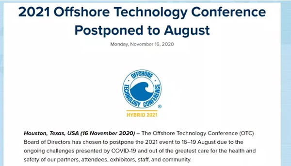 2021年美國(guó)石油展OTC推遲至21年8月,具體舉辦日期尚未確定。