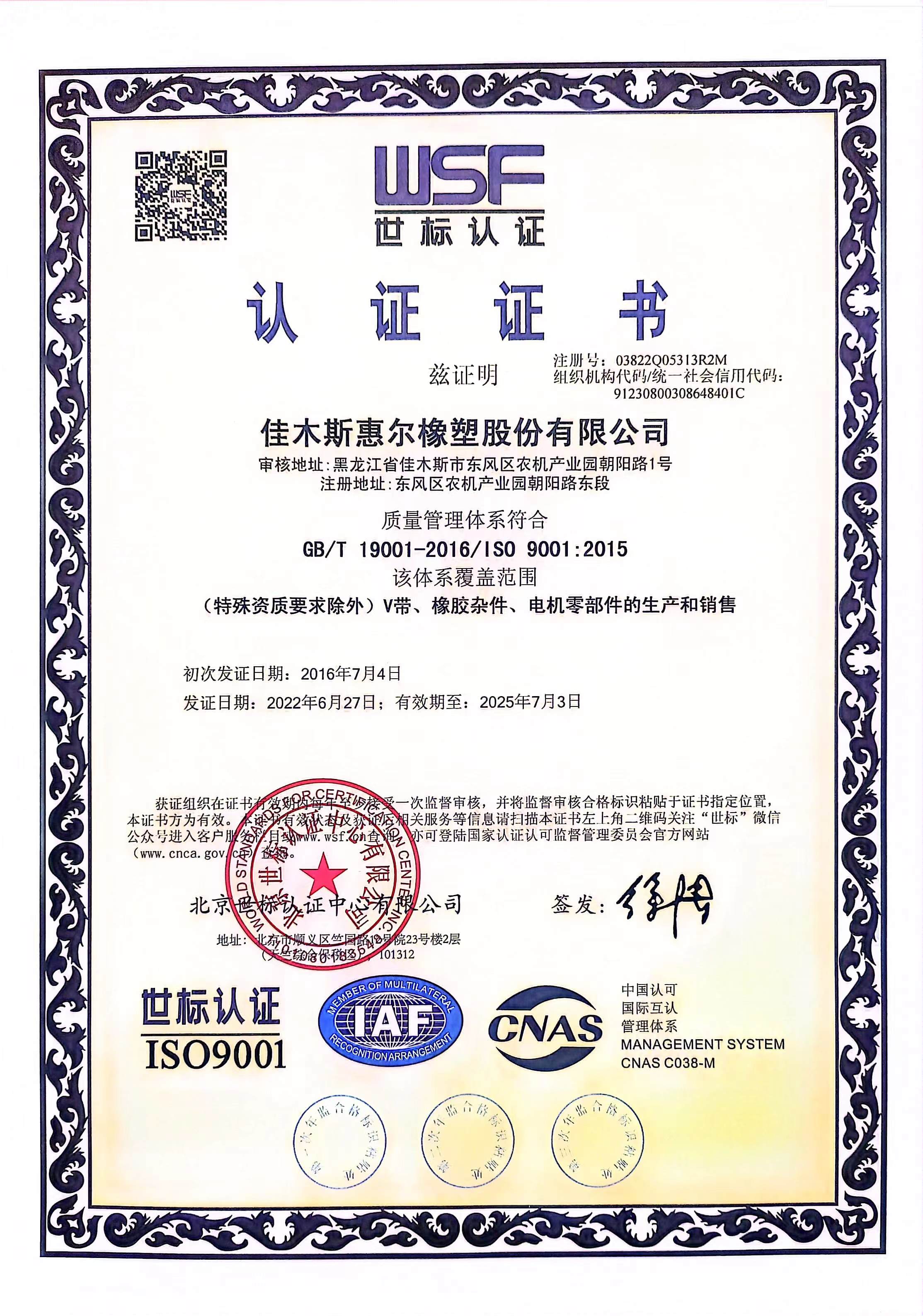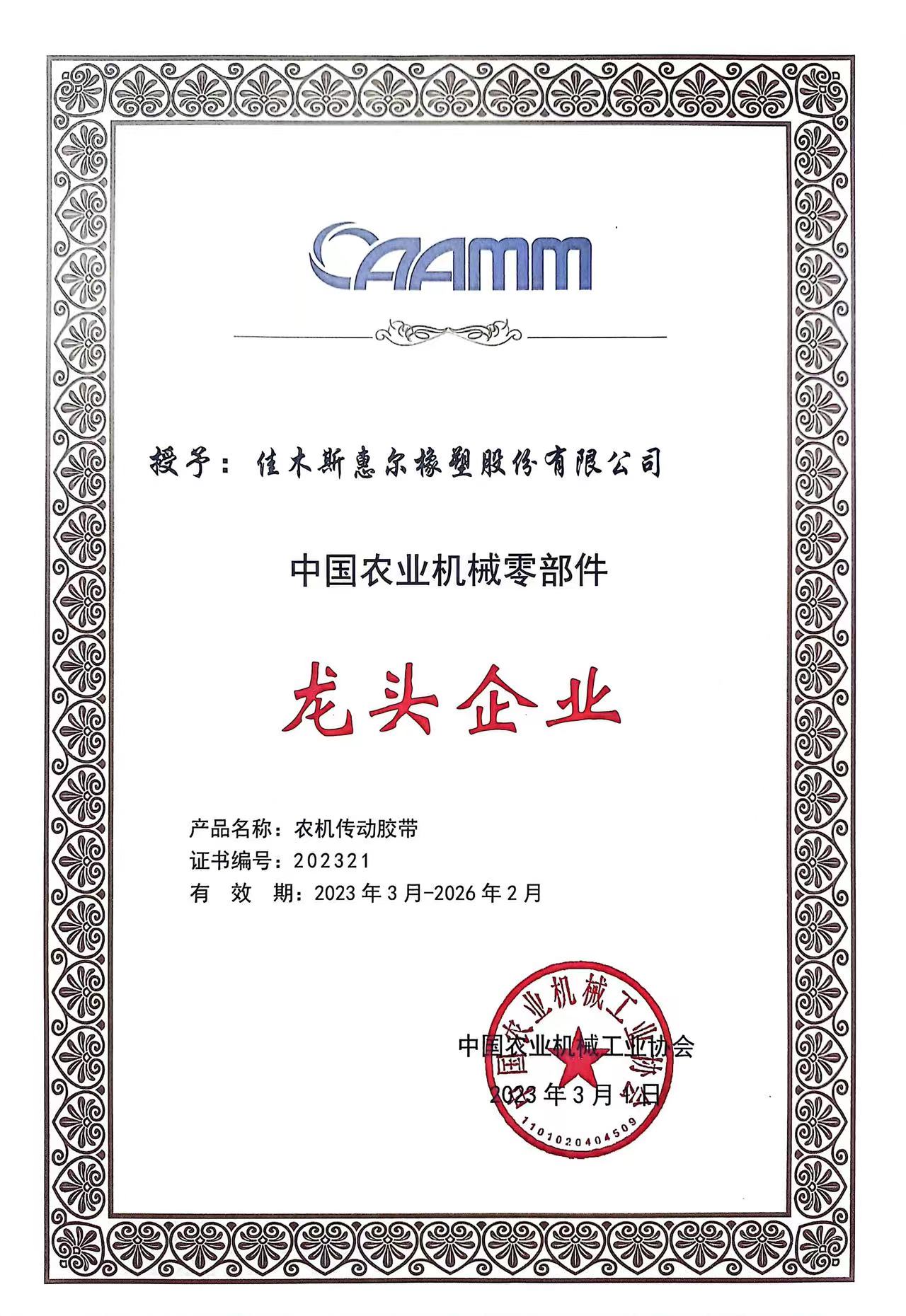 公司通過(guò)了ISO9001:2016質(zhì)量管理體系認(rèn)證,榮獲了高新技術(shù)企業(yè)稱號(hào),獲得了由中國(guó)農(nóng)業(yè)機(jī)械工業(yè)協(xié)會(huì)授予的農(nóng)機(jī)零部件(橡膠傳送帶)“龍頭企業(yè)”證書(shū)。環(huán)星品牌被評(píng)選為 “精耕杯”用戶滿意十佳農(nóng)業(yè)機(jī)械零部件產(chǎn)品金獎(jiǎng)。產(chǎn)品還獲得全省用戶滿意產(chǎn)品、黑龍江省榮譽(yù)。